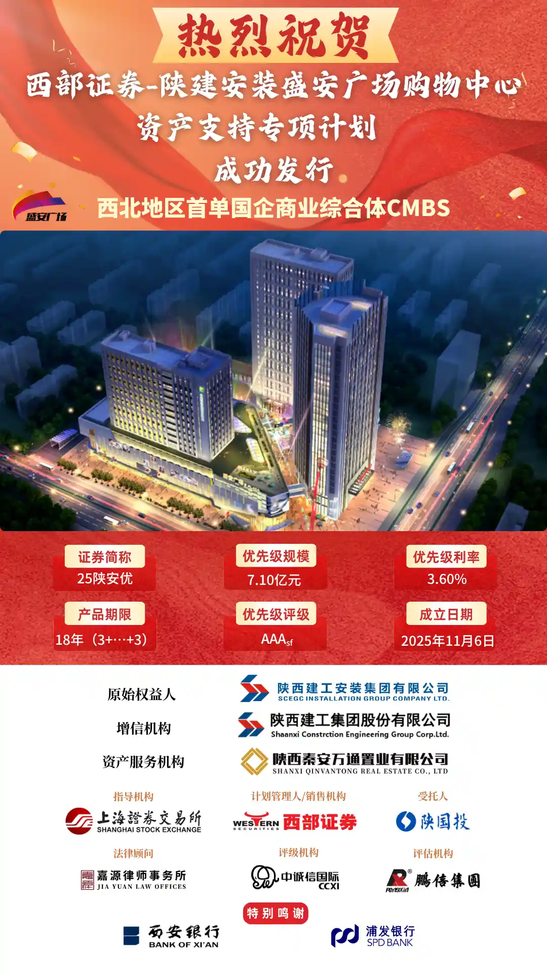 11月6日,在上海证券生意所指导下,由西部证券担当妄想管理人及销售机构的“西部证券—陕建装置盛安广场购物中心资产支持专项妄想(CMBS)”乐成刊行,刊行规模7.11亿元,限期18年,评级AAAsf,票面利率3.6%。本次CMBS由中国企业500强第120位的陕西建工集团股份有限公司(600428.SH)提供外部增信,是西北地区首单国企商业综合体消耗基础设施资产证券化产品。