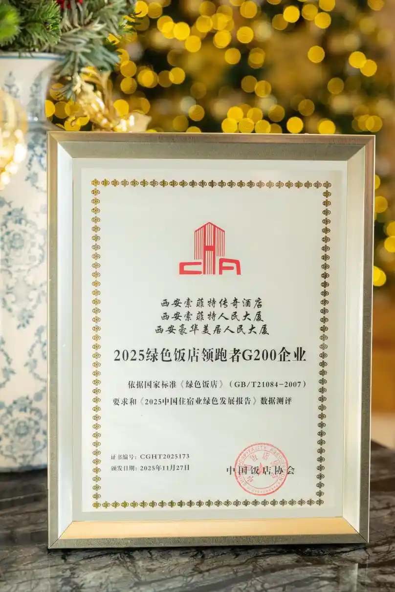 克日,西安人民大厦索菲特传奇旅馆、索菲特旅馆、豪华美居旅馆配合斩获“2025绿色饭店领跑者G200企业”声誉,以扎实的绿色运营效果领跑行业。